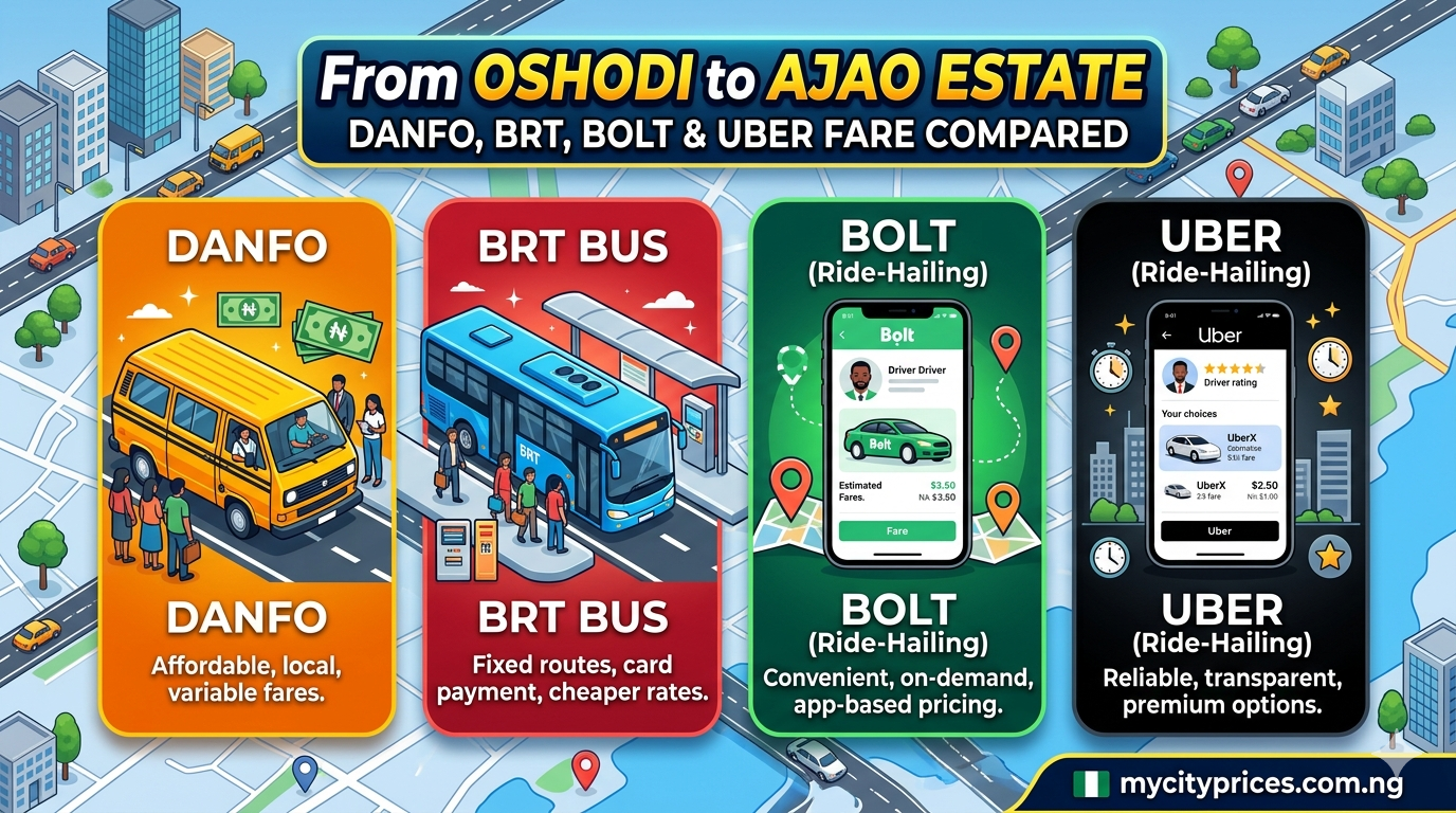 Many people search online to know how much transport costs from Oshodi to Ajao Estate using Danfo, BRT, Bolt, or Uber.